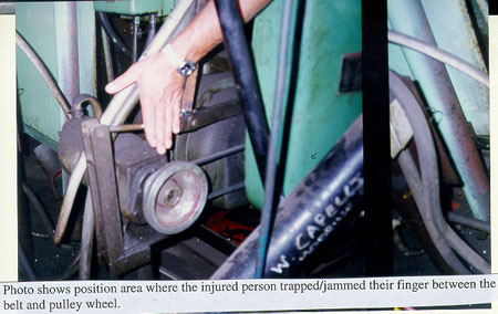 The injured person was employed as an apprentice machinist. It was his first week of his apprenticeship with the company. The injured employee was standing beside a metal lathe observing the work being performed on the lathe by his foreman/tradesman, when he was instructed by the foreman to go to the rear side of the lathe and remove a drive belt that was connected from a single phase motor pulley wheel to a pulley wheel on the lathe. While carrying out this task the employee's fourth finger on his left hand was dragged along the moving belt and trapped/jammed between the belt and the steel pulley wheel of the single phase motor requiring the top section of that finger to be surgically amputated. The defendant pleaded guilty.