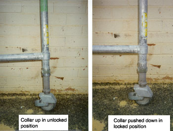 The accident occurred when the injured person was working on the top platform of a scaffold, at a height exceeding 4 metres, when one wheel (caster) assembly collapsed. The collar to the threaded wheel shaft was not in the locked position (refer to photograph) and when the scaffold was loaded in this region the scaffold slipped down the threaded wheel shaft. The scaffold was not erected by a certificated scaffolder as required by the legislation. The injured person's injuries included a broken right radius and ulna after jumping clear of the aluminium mobile scaffold as it collapsed. His Worship said that clearly the defendants were not uncaring employers and that they appeared to be generally aware of their responsibilities to their workers. In this case, His Worship said, there had been a breakdown of that caring, perhaps due to several factors, perhaps only due to one. His Worship said that the employees had erected the scaffold with some degree of negligence because they had not been properly advised. His Worship took into account the safety strategies in place before and after the accident and the fact that there were not previous offences. The defendant is one of three companies acting in partnership, the business name of which is Metrowest Electrical and Communications. The defendant pleaded guilty.