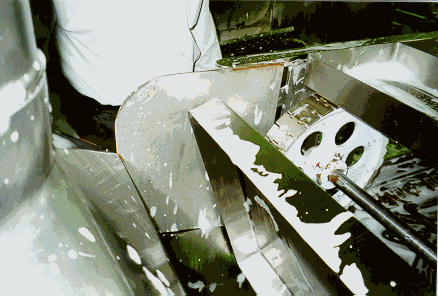 Contract cleaners were used to clean equipment at this meat export processing establishment. On 21 August 1997 a female cleaner with three months service was cleaning the pork viscara table while it was running. During this process the worker became entangled in the machinery and suffered a fractured rib, contusion of the lung, a crushed liver, ulnar nerve damage and paraesthesia of the face.