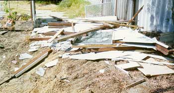 The defendant was contracted to demolition a single storey brick and tile residence, which contained asbestos cement sheeting. A witness stated that the defendant was using an excavator to break up the asbestos cement sheeting and was also concerned about the dust not being suppressed during the demolition process. At the site, the WorkSafe WA inspector observed rubble piled into heaps which contained broken fragments of asbestos cement sheeting. Another pile or rubble as shown in the photograph, appeared to have been the remains of an asbestos clad outbuilding that had been smashed into small pieces. Chemical analysis of the rubble confirmed the presence of chrysotile and crocidolite asbestos. The defendant pleaded guilty.