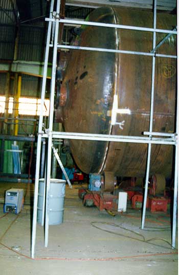 Two workers were working on the pressure vessel shown in the photograph, reshaping plate nozzles to fit onto the flange shown about 3 metres above ground level.