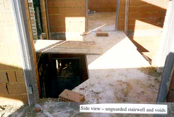 During an inspector's inspection of the site a number of hazards and breaches were identified such as: * unsafe access/egress to working platforms of scaffold and first floor slab areas, (the photograph is an example of this hazard). * Unguarded stairwells. * Debris scattered over the site, in access ways and on working platforms. * Scaffold planks spanning between units and erected on handrails of scaffold. * Missing edge protection on scaffold. * Missing scaffold planks/incomplete working platforms. * Drums used as scaffold. * Open edges from fixed platforms and stairways.
