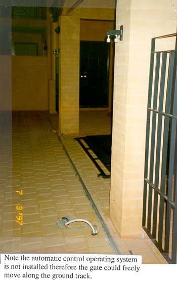 The centre closing twin security gates were installed by the fabricator to the entrance portico of a townhouse development in preparation for connection of the automatic control operating system (electric motors, gear racks). The steel gates, weighing in excess of 80kg each, were mounted on rollers that fit onto a ground track. Top restraining or guide rollers hold the gate vertical and allow the gates to glide with ease.