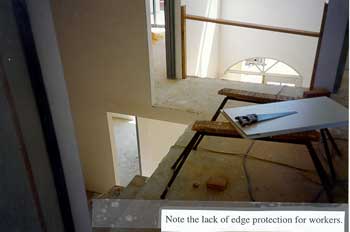 The defendant had not provided edge protection to the internal stairs leading to the first floor slab or the first floor slab itself. Both tradespersons were exposed to the hazard of falls from height due to a lack of edge protection. The fall height from the first floor slab was approximately 2.65 metres.